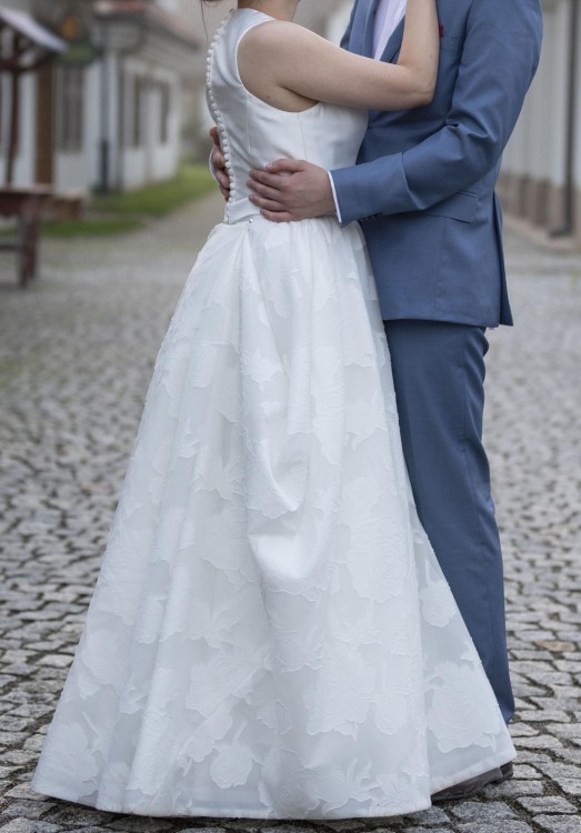 Niestety nie mam jeszcze zdjęć od fotografa, dlatego załączam zdjęcie, które wykonał znajomy telefonem oraz zdjęcia katalogowe - suknia wygląda identycznie, prócz tego, że jest krótsza.