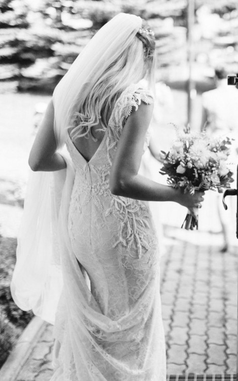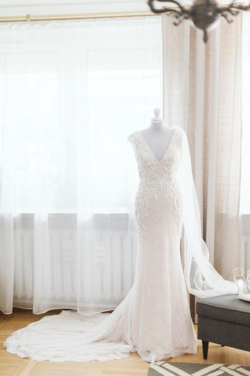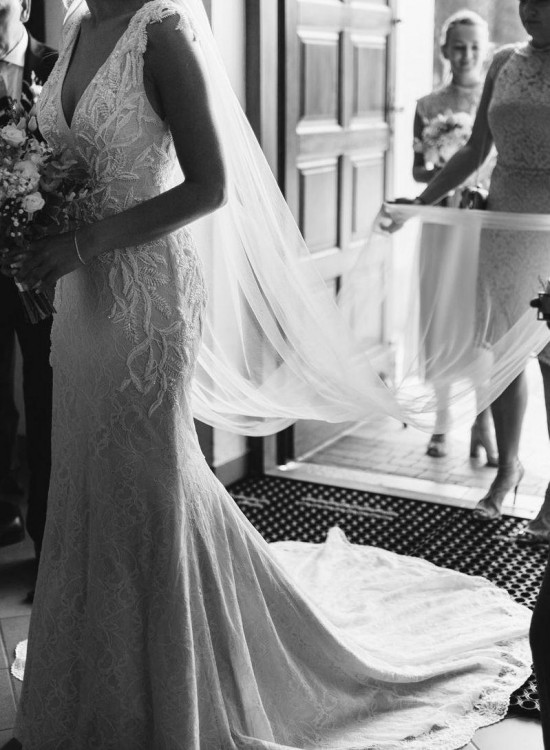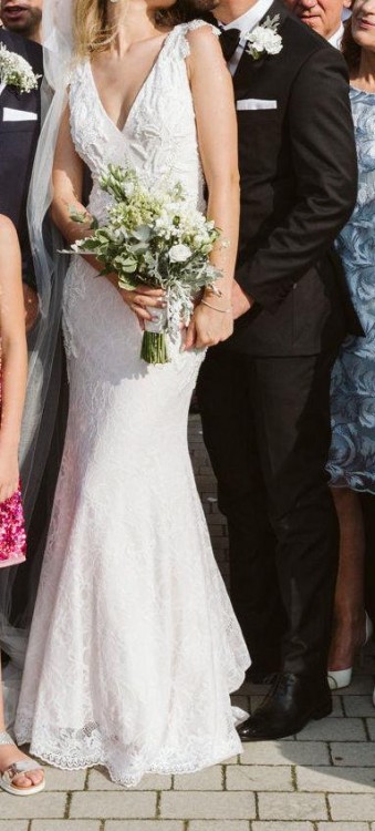 Model w kroju syreny z koronki Chantilly z piękną aplikacją wysadzaną błyszczącymi koralikami, dekoltem V i plecami głęboko wyciętymi w literę V, z trenem. Bardzo wygodna, elegancka i kobieca.