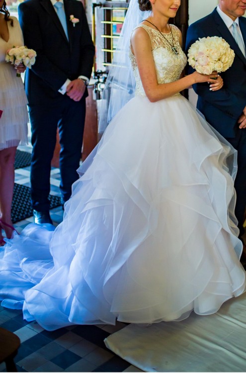 Suknia ślubna Justin Alexander SIGNATURE 9847 zakupiona w salonie, ogłoszona została suknią roku 2018. Suknia pięknie podkreśla talię, mimo wielu warstw falban jest lekka i pięknie układa się w tańcu.