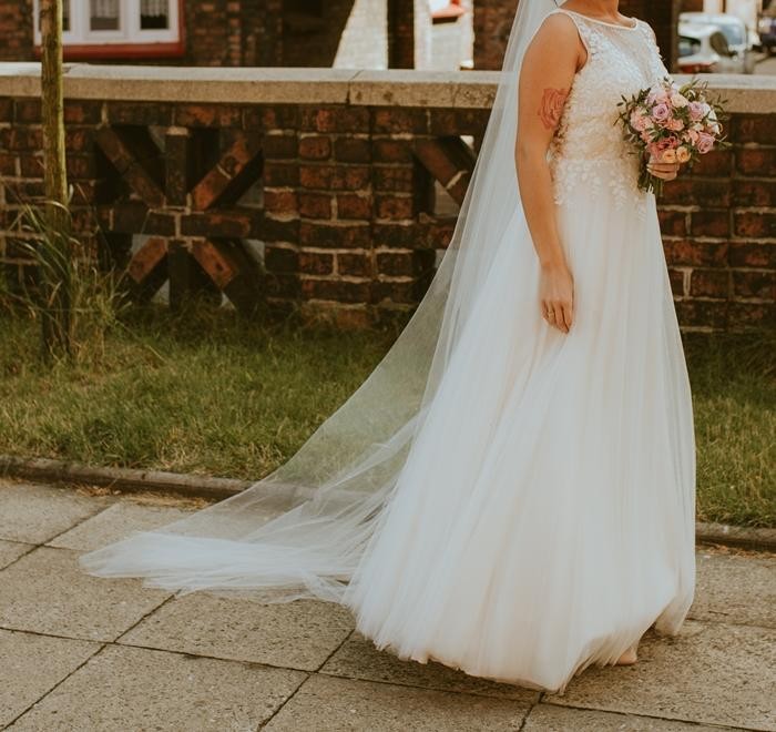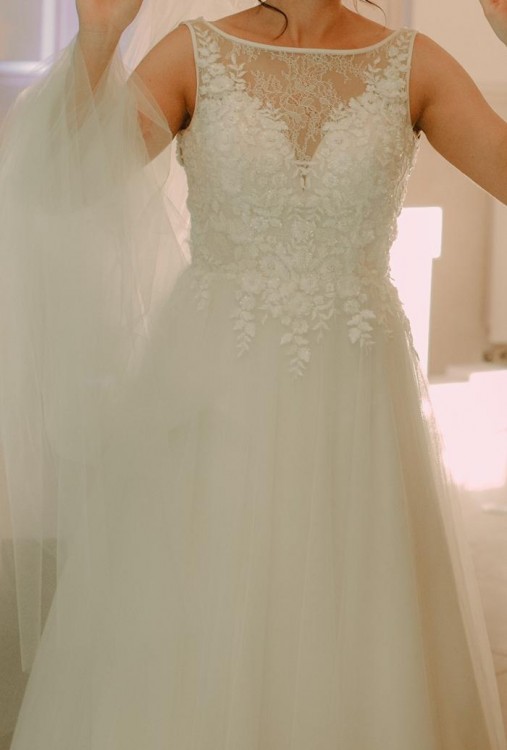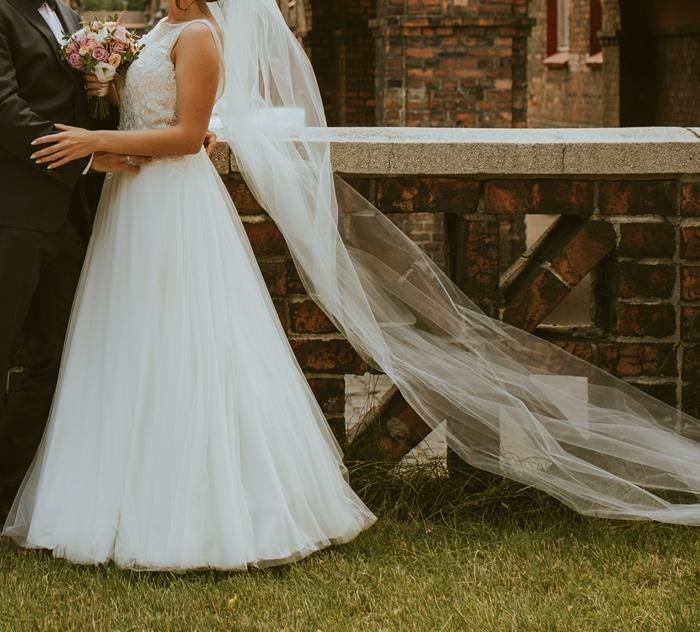 Suknia jest lekka, delikatna i romantyczna. Po kilku godzinach zabawy nie odczuwa się jej ciężaru. Na gościach zrobiła ogromne wrażenie, a ja czułam się wyjątkowo :) Suknia ma wszyte miseczki na biust w rozmiarze B. Cena w salonie to 3390, dorzucam dodatkowo welon gratis, oraz halkę z kołem pod suknie i pokrowiec.
