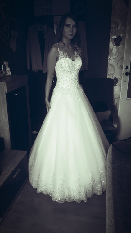 Suknia Justine, kolekcja z 2017 r. Dekolt w łódkę, wszyty biustonosz co daje ogromny komfort podczas użytkowania. Suknia jest długa do ziemi,z obciążonym dołem dzięki czemu pięknie się układa,zwłaszcza podczas tańca. Tren krótki. Nie wielkie uszkodzenia u dołu sukni,mało widoczne. Gorąco polecam, ten dzień był wyjątkowy dzięki tej sukni.
