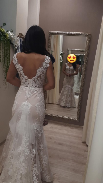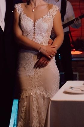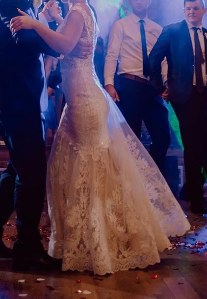 Suknia koronkowa lekko połyskujaca, typu rybka/syrenka, z podpinanym terenem na 3 guziki. Suknia jest bardzo wygodna nie sprawia problemów w czasie tańca, świetnie podkreśla sylwetkę, ślicznie eksponuje plecy jest idealna. Założona tylko w dniu ślubu. Stan bardzo dobry.