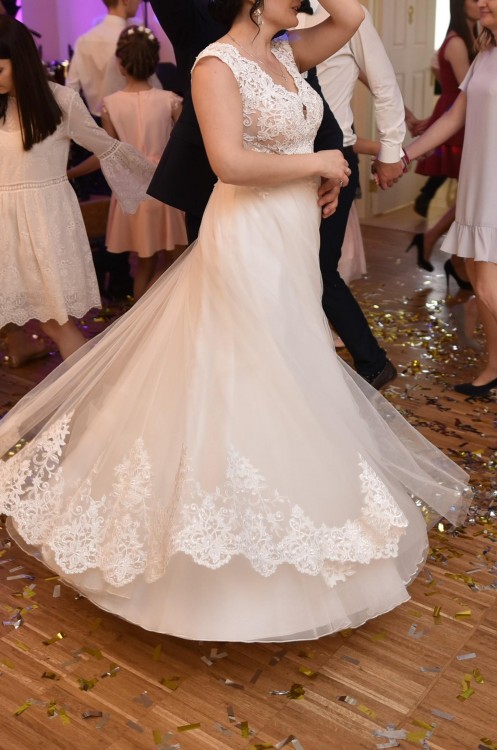 Góra sukni jest bogato zdobiona koronką, wszytą na półbeżowym materiale, co daje eleganckie wykończenie. Plecy wycięte w literę V, dekolt również, zasuwana na zameczek.