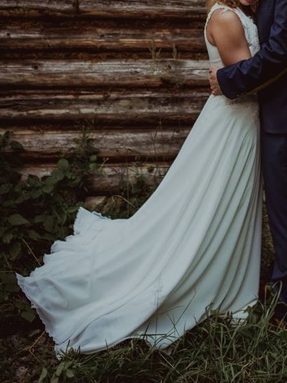 Koronka wyklejana ręcznie, a nie uszyta z całego materiału, przez co dodaje to sukni delikatności i nie wygląda jak firanka. Koronka z drobnymi mieniącymi się koralikami - nie ociera i nie drapie!