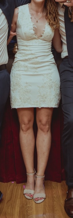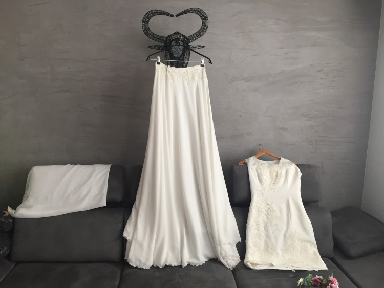Krótka sukienka jest uszyta z rozciągliwego i bardzo wygodnego materiału wyglądającego jak atłas, długa z podszewką i 3 warstwami tiulu, z lekkim trenem (nie przeszkadza w chodzeniu). Zamek niewidoczny, długa spódnica zapinana na zatrzaski.