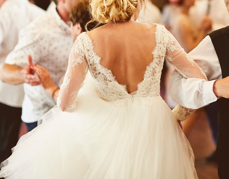 Suknia ma wszyte mocowania na biustonosz (na ramionach oraz z tyłu na pas). Tył sukni mocno wycięty w literę V.
