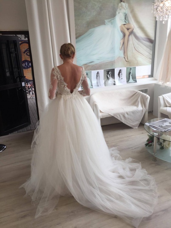 Jest to model Kelsi z dołem Maureen z indywidualnymi modyfikacjami - ma piękne długie koronkowe rękawy oraz dopinany tren, który w kościele wyglądał bardzo efektownie (rękawy są mobilne i można je odpiąć - ja jednak nie skorzystałam z tej opcji ponieważ za bardzo mnie urzekły ;) ). Kolor off-white.