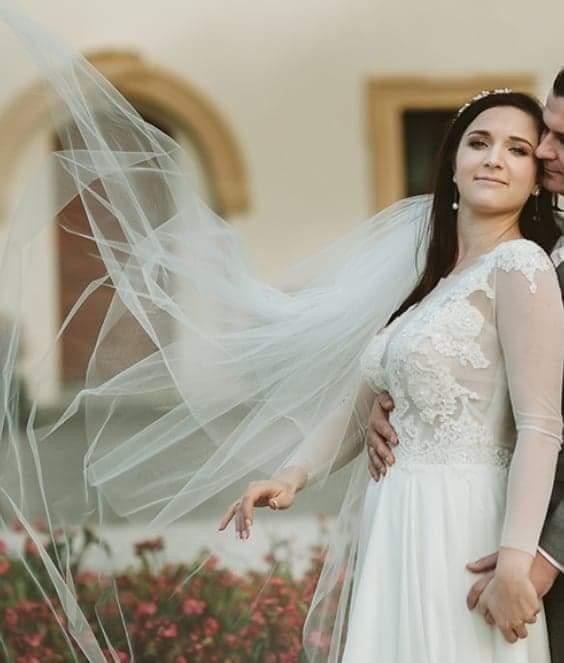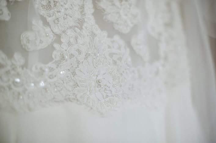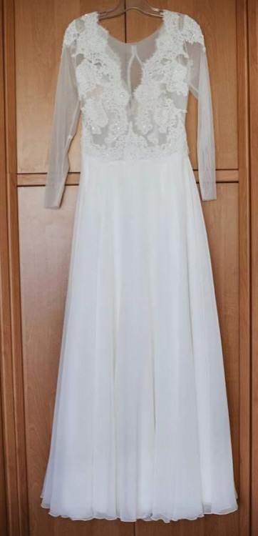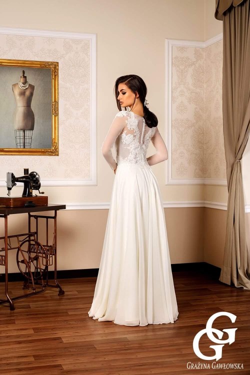 Suknia ślubna w kolorze off white z rękawami oraz ręcznie naszywaną koronką. Pięknie eksponuje dekolt, plecy i talię.