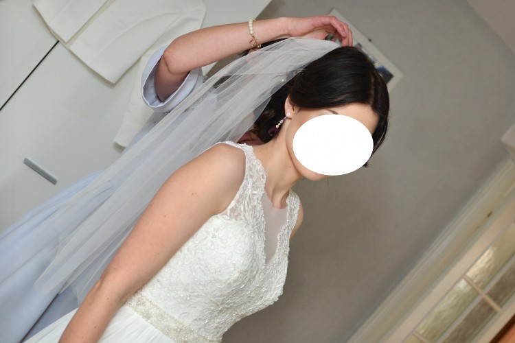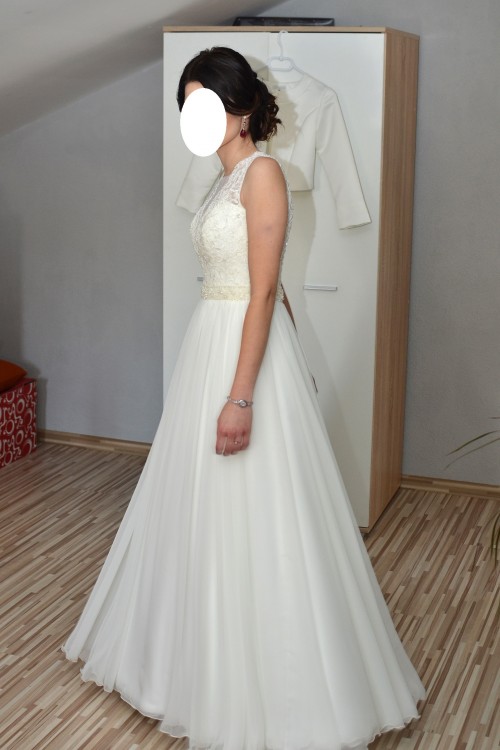 Sprzedam piękną Suknię Ślubną kolekcja Sensual/ Surina. Suknia kupiona w kwietniu 2017 w Salonie Sukien Ślubnych AFRODYTA, szyta na zamówienie - stworzona z modelu SENSUAL - góra sukni -, dół model SURINA (materiał muślin). Suknia szyta na miarę, na wzrost 164 cm + obcas ok. 7 cm. Rozmiar 34/36. Założona 2 razy w Dniu Ślubu i podczas sesji ślubnej. Kolor: ecru. Suknia posiada pięknie zdobiony pasek wykonany z perełek i kamyczków. Tył zdobiony guziczkami. Jej subtelność podkreślała piękny, zwiewny, muślinowy dół, suknia pięknie układa się w tańcu. Jest lekka, zwiewna i bardzo wygodna. W komplecie halka, posiadam również koło, które nie było przeze mnie zakładane ponieważ również bez niego suknia pięknie się układa.