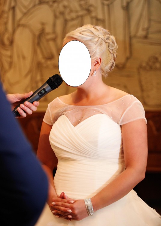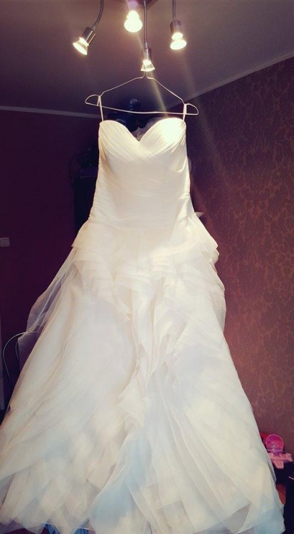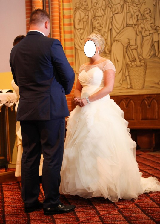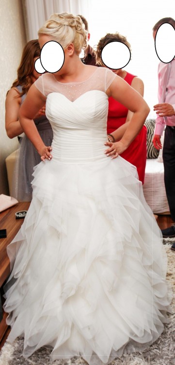 Suknia jest jednoczęściowa, wiązana z tyłu gorsetem więc pasuje na różne rozmiary biustu. Bez koła.Posiada Halkę oraz tren który można podpiąć do sukni. Przód sukni w kształcie serca. Dodatkowo dodaję bluzeczkę z kryształkami svarowskiego którą można ściągnąć w każdej chwili.