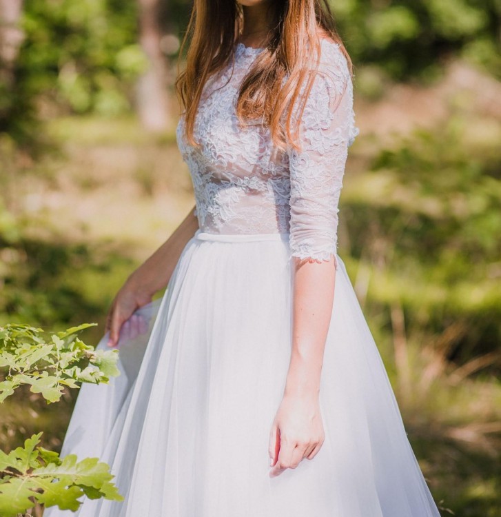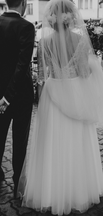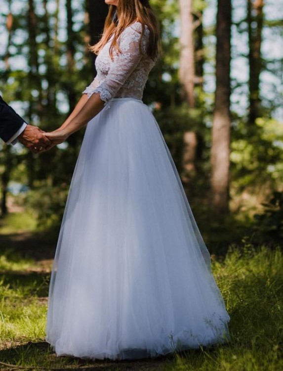 Suknia jest w bardzo dobrym stanie. Została oddana do pralni chemicznej. Jest w białym kolorze. Góra sukni wykonana jest z ręcznie zdobionej koronki. Dół to cztero-warstwowy, delikatny tiul.