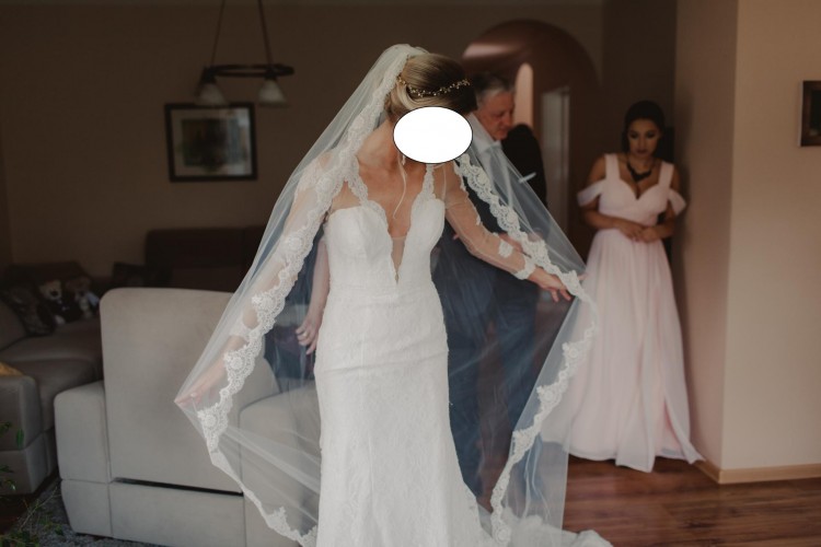 Suknia kupiona była w jednym ze szczecińskich salonów ślubnych. Sukienka dobra będzie dla osób na wzrost 165-175 cm + obcas 6-8 cm. Do sukienki dołączam długi welon z ozdobną koronką, który ma długość ok. 3 m. Zarówno suknia jak i welon są wyprane i gotowe do użycia :)