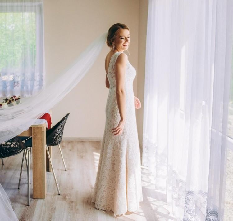 Suknia mimo, iż lekka składa się z 4 warstw- podszewka oraz druga warstwa materiału w kolorze beżu, podszewka pod koronka i koronka w odcieniu złamanej bieli. Suknia bardzo wygodna, wykończona w najmniejszych detalach i przede wszystkim mega kobieca. Krój kielicha można dodatkowo wyeksponować zakładając koło(dorzucam gratis) za pomocą koła można wyregulować długość i "skrócić" o parę cm- będzie wiec pasować też na osoby niższe bez poprawek krawieckich. Suknia zapinana na zamek+perełki. Dla większego komfortu wszyty biustonosz, z możliwością wszycia własnego.