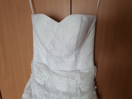 Sukienka szyta wg mojego pomysłu. Jest w stanie idealnym, ponieważ miałam ją na sobie w USC oraz potem ok 4 h na obiedzie poślubnym. Założona również na krótką sesję, ale z racji swej długości nie miała się jak zniszczyć. Profesjonalnie wyczyszczona, pokrowiec oczywiście w komplecie.