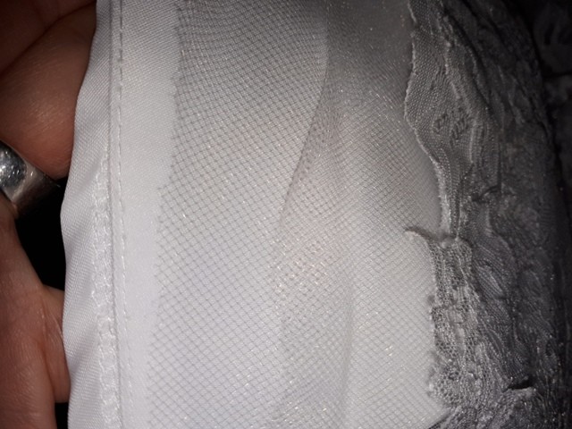 Gorset z cięciami francuskimi, idealnie trzyma. Koronka na sukience miękka, nie super elastyczna, w 80 % składa się z bawełny, nie sztuczna, nie świecąca. Pod koronką atłas z nitką jedwabną, specjalnie lewą stroną na wierzch, by bardziej matowa strona była widoczna pod koronką. Do tego dwie warstwy elastycznego tiulu oraz podszewka, powodują, że spódnica pięknie się układa(warstwy na foto).