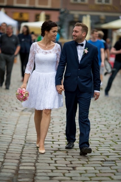 Sprzedam piękną suknię ślubną. Krótką. Zakupioną w 2016 w salonie sukien ślubnych Madleine, przy ulicy Głogowskiej w Poznaniu.