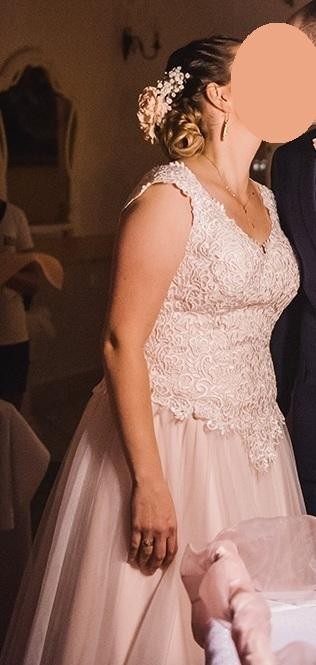 Suknia szyta na łososiowym podkładzie, wierzch sukienki wykonany z miękkiego, lejącego tiulu w kolorze śmietankowym. Gorset sukni wyszywany ręcznie koronką gipiurową.