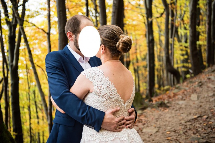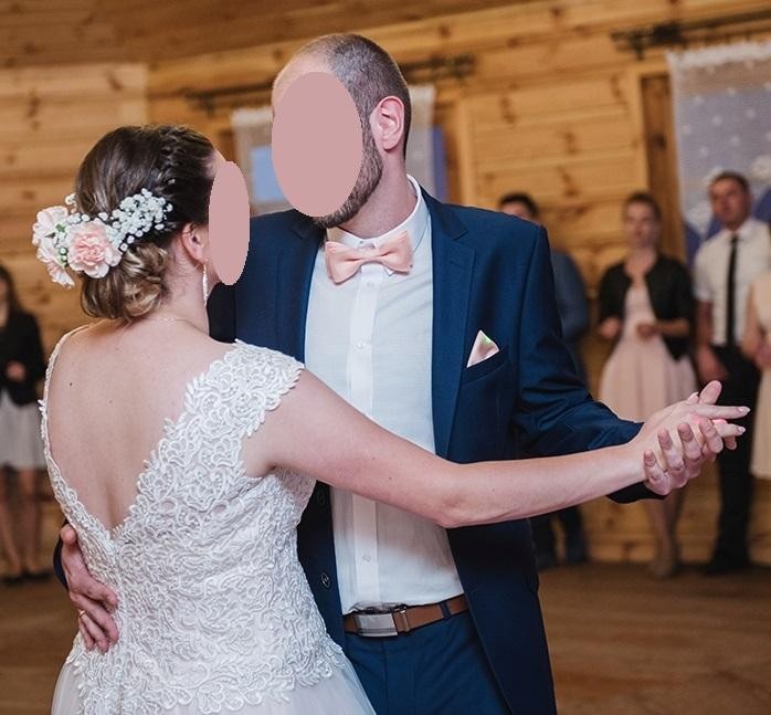 Suknia została ubrana tylko dwa razy (ślub, sesja ślubna). Jest w stanie idealnym, brak zaciągnięć, plam i innych uszkodzeń.