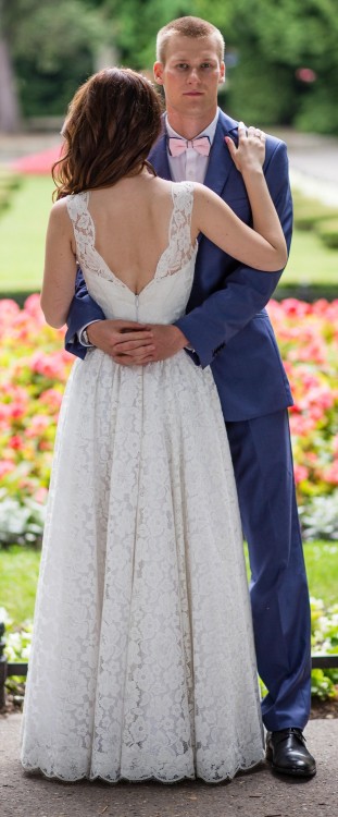 Suknia jest cała z koronki, kolor śmietankowy. Jest przyozdobiona paskiem z cyrkonii. Góra gorsetowa zapinana na zamek. Przód i tył z dekoltem w "V". Ma wszyty stanik. Była założona bez koła.