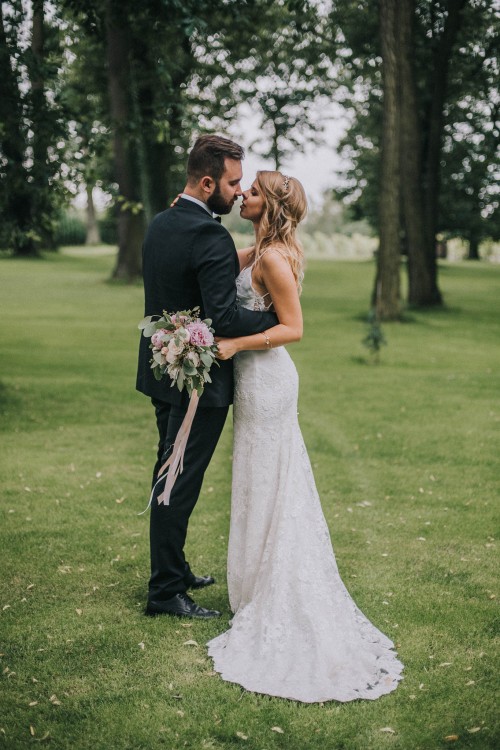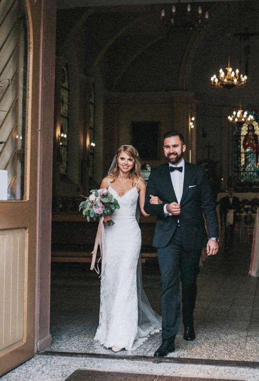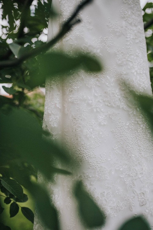 Suknia została wykonana wg mojego projektu. Cała jest z koronki w kolorze ecru. Tren podpinany na guziczki, chociaż ani razu go tak nie podpinałam, ponieważ ma jeszcze dodatkowo doszytą bransoletkę i można nosić tren na ręce. Całe wesele tak przetańczyłam :)