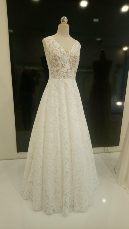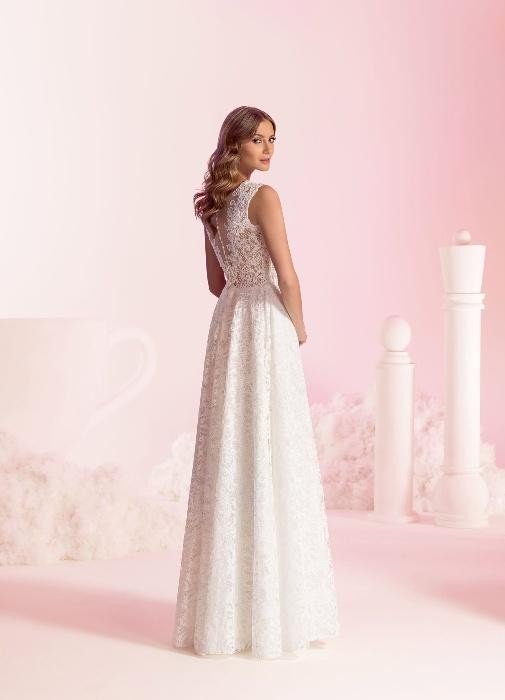 Fason prosty bez trenu, koronka, kolor ivory, bez rękawów, dekolt w V, z tyłu tzw. dekolt illusion (zabudowany delikatną siateczką i wykończony koronkową aplikacją na bokach), zapięcie częściowo na zamek i ozdobne guziczki.
