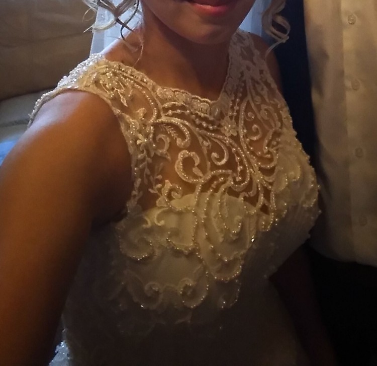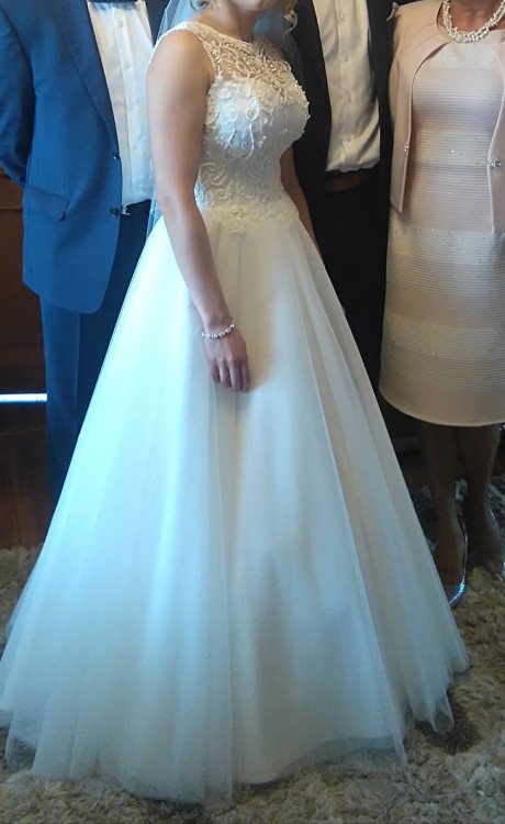 Góra sukni wykonana z koronki, obszyta koralikami i kryształkami (pięknie się mieni). Tył regulowany, niski gorset na sznureczku. Całość zapinana na guziczki.