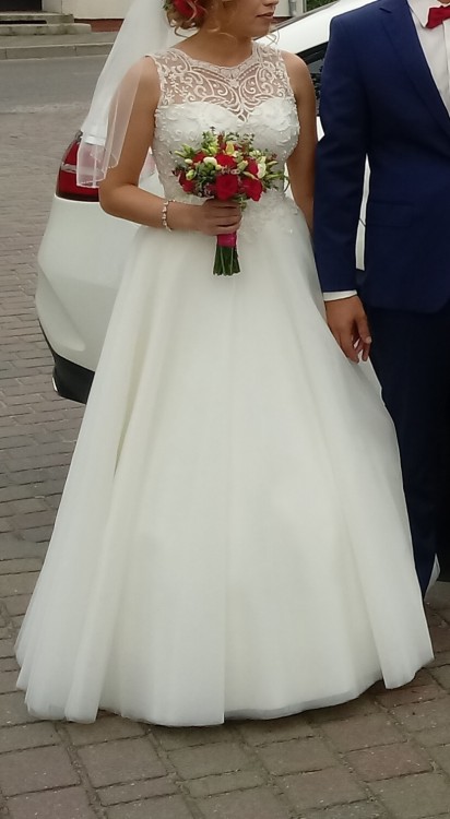 Sprzedam koronkową suknię ślubną firmy DIANA, model 2017, szyta na miarę - rozmiar 36-38, wzrost 165cm + 8 cm obcas. Kolor IVROY.