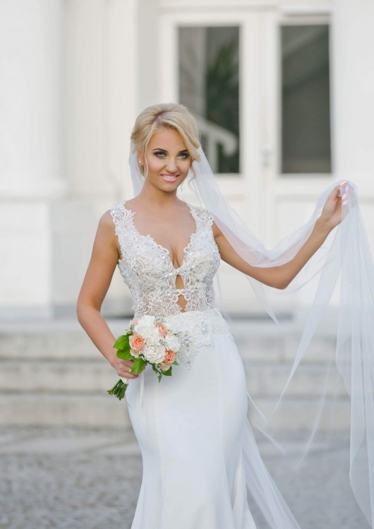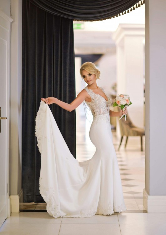 Suknia uszyta na wzrost 169 + 10 cm obcas. Rozmiar 36-38. Suknia ozdobiona koronką z koralikami. Posiada tren, który może być podpięty na dwa sposoby. Dodatkowo suknia posiada jeszcze wszyty sznureczek do trzymania trenu w dłoni.