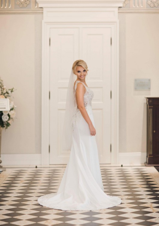 Do kompletu długi 3 metrowy welon oraz biżuteria na plecy, przypinana do tyłu sukni. Polecam!