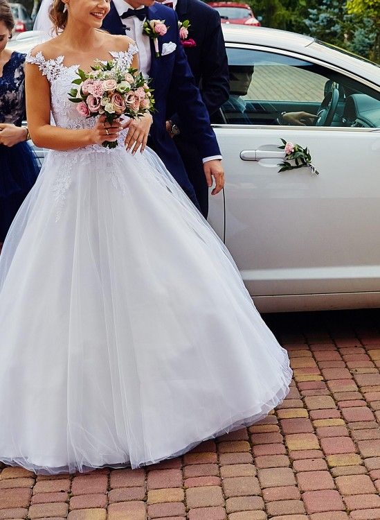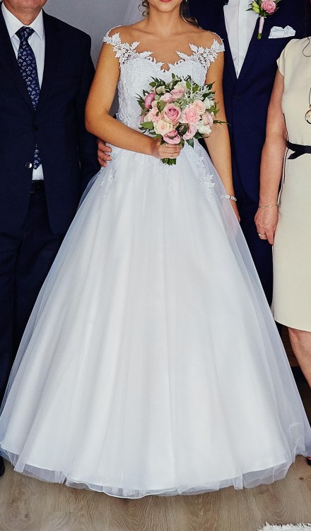 Suknia w kolorze białym, kształt litery A. Góra zdobiona koronką, wzbogacona ślicznie mieniącymi się kryształkami. Plecy koronkowe na kształt litery V, zapinane na ozdobne guziczki. Dół sukni wykonano z kilku warstw tiulu. Suknia jest bardzo lekka, zwiewna i co najważniejsze wygodna w noszeniu.
