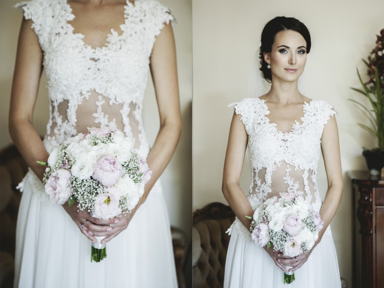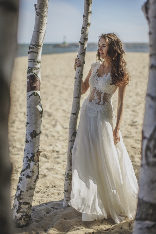 Suknia jest jednoczęściowa. Sklada się z dwóch warstw najwyższej jakości koronki francuskiej, wyszywana drobnymi kryształkami + lekki, zwiewna muślinowy dół. Plecy i pod biustem prześwitująca elastyczna bawełniana siateczka.