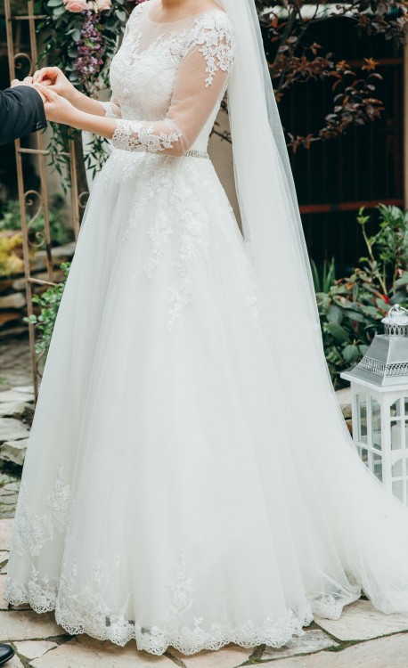 Sprzedam suknię ślubną zakupioną w salonie Madonna w Warszawie 2017r. Cena 2 500zl (kosztowala 4800 zł). Jest w 100% oryginalna, szyta na miarę. Suknia jest jednoczęściowa, w kolorze śmietankowym, szyta na rozmiar 36, wzrost 170 cm + 9 cm obcas (można ją bez problemu skrócić). Góra sukni jest cała w przepięknej koronce, dekolt w kształcie serca. Koronka delikatnie nachodzi na dół sukni. W pasie jest subtelna tasiemka z kamieniem. Jest to suknia typu "księżniczka" Suknię można założyć bez biustonosza.