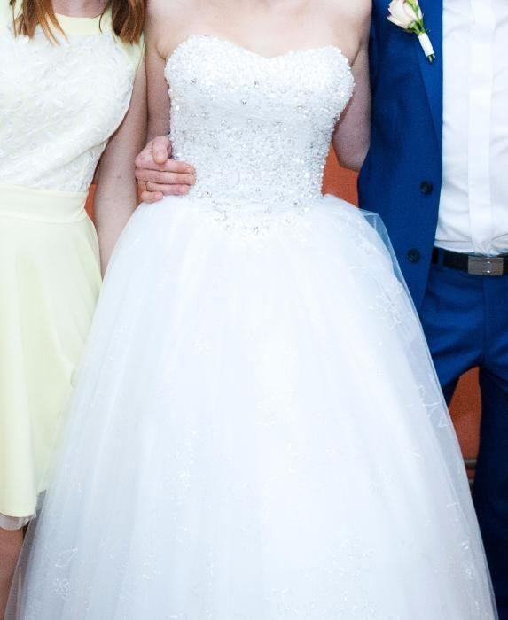 Witam serdecznie do sprzedania mam suknie ślubną LULU kolor biały ubraną tylko 1 raz. Suknia była specjalnie szyta na miarę w salonie w 2016 roku. Suknia pasuje na rozmiar 36,38,40 z tego względu że z tyłu na plecach sukienka jest wiązana...Wzrost 166cm+6cm obcas.Gorset jest wykonany ręcznie kryształkami swarovskiego co nadaje jej piękny i błyszczący wygląd. Dół sukienki jest wykończony koronką. Dodatkowo w gorsecie sukni są wszyte gąbki z biustonosza aby biust byl bardziej podkreślony.Warstwy tiulu są z brokatem( są 2dziurki u dołu, ale można dół trochę obciąć lub zlikwidować ta warstwę brokatowa) jest ręcznie wyszywana.