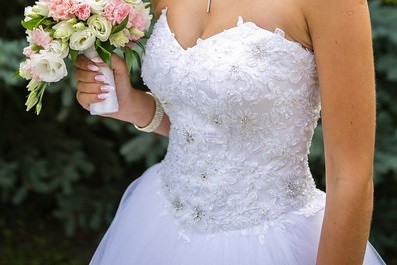 Witam. Mam do sprzedania suknię ślubną "Księżniczkę". Suknia jest z gorsetem, który z tyłu jest wiązany, dół sukni uszyty jest z tiulu. Na gorsecie znajdują się aplikacje z cyrkoniami. Suknia posiada doczepiany tren. Suknia ta była szyta na miarę. Ja noszę rozmiar ubrań 32/34. Więcej informacji udzielę telefonicznie. Zapraszam do obejrzenia sukni oraz przymiarki.