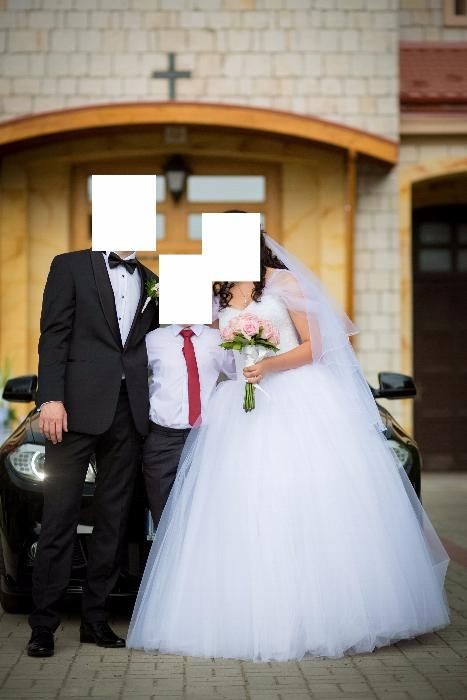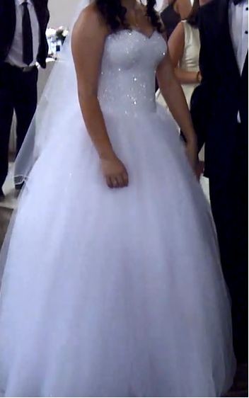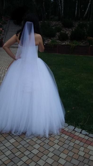 Witam. Mam do sprzedania używaną suknię ślubną. Zakupiona została w salonie Madonna Exlusive w Krakowie. W zestawie welon z identycznymi kryształkami jak na gorsecie. Sukienka posiada koło do wysokości kolan. Możliwość demontażu koła. Sukienka w bardzo dobrym stanie. Gorset mocny, sztywny, korygujący. Sukienka dzięki wiązaniu z tyłu pozwala na dopasowanie do kilku rozmiarów, Dopasowana na wzrost 167 plus 10 cm obcas. Nadaję się dla osoby z rozmiarem M,L. Gorset pokryty delikatnymi kryształkami ręcznie przyszytymi. Polecam