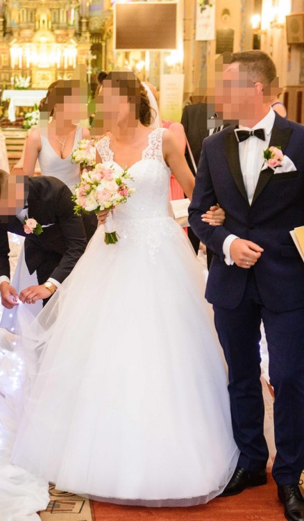 Jedna z wartw tiulu posiada niewielkie uszkodzenie na dole, nie będzie problemu z jej wymianą. Suknia wyprana w pralni.