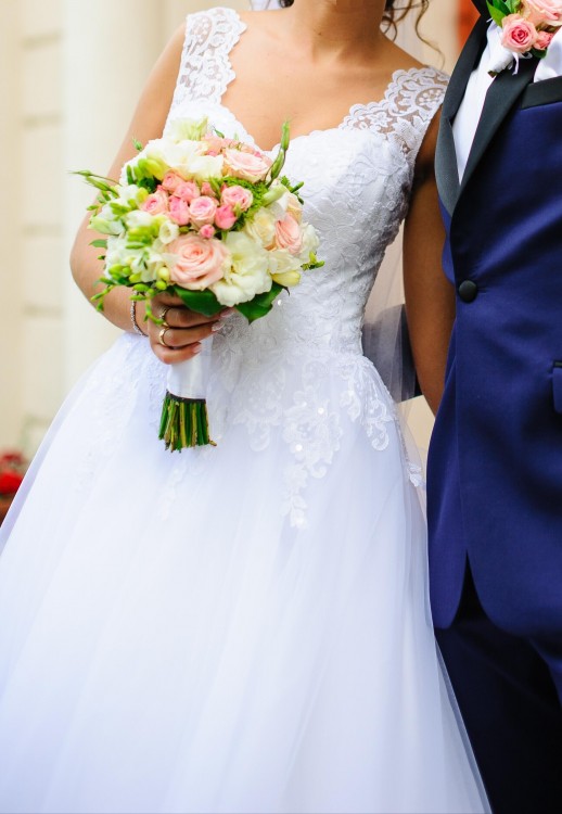 Sprzedam śliczna suknię ślubną zakupioną w salonie Adria w Tłuszczu k. Warszawy. Suknia jest w kolorze śnieżno białym. Rozmiar sukni 34, szyta na wzrost 160cm + 9cm obcas. Suknia ma wszyty gorset wykonany z koronki ozdobionej białymi cekinai na dwlikatnych koronkowych ramiączkach. Tył sukni posiada ozdobne wycięcie na. kształt litery V. Dół sukni wykonany z wielu warstw tiulu oraz grubszego materiału. Posiada dwa koła, które można wyjąć, co nie odejmuje sukni uroku a czyni ją mniej obszerną.