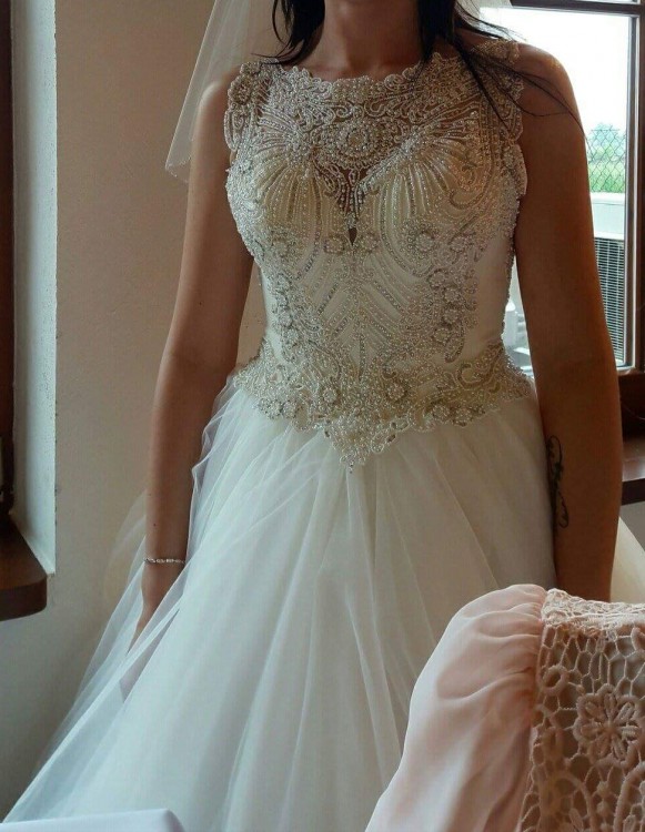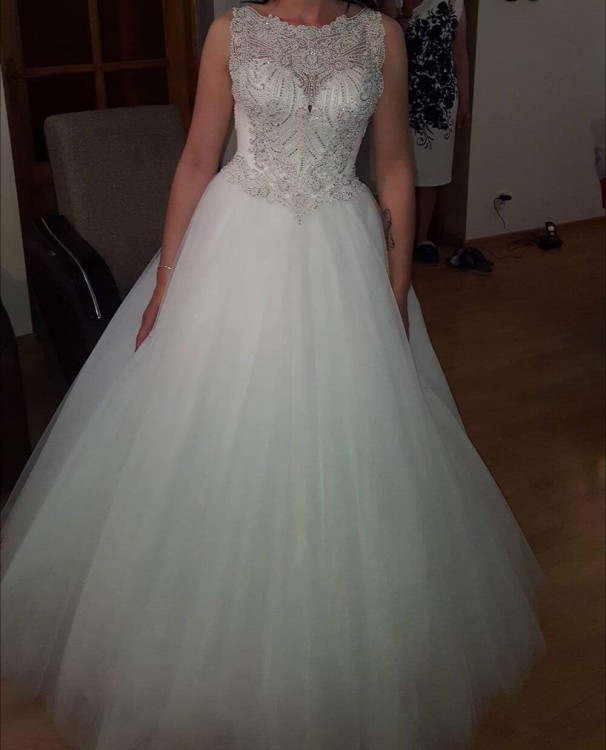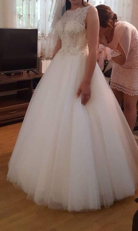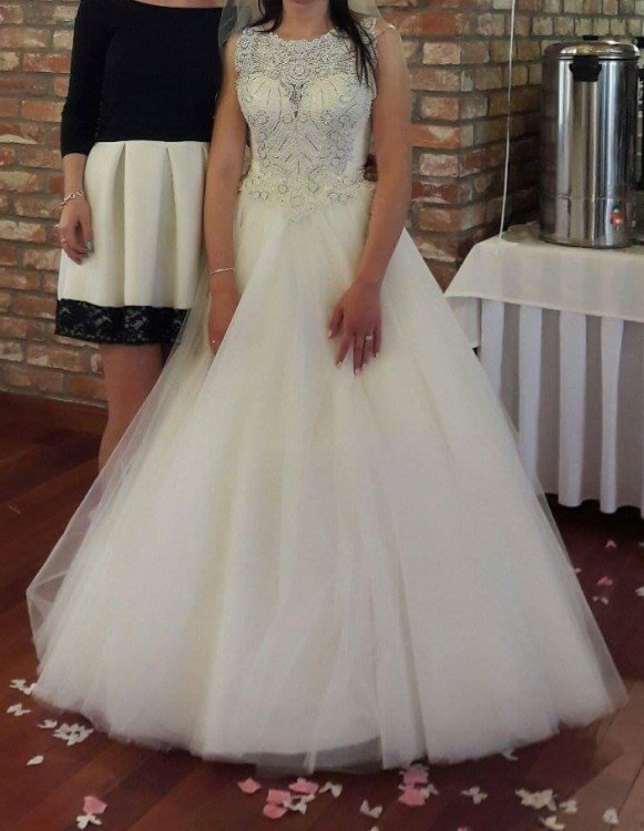 Na sprzedaż przepiękna suknia ślubna rozmiar 36,38. Kupiona w salonie gdzie została stworzona na wzrost okolo 166 cm. Zarówno w płaskich jak i w wysokich butach sukienka prezentuje się świetnie. Góra wysadzana krysztalkami oraz kamieniami. Tył zapinany na guziczki, sznurowany oraz zapinany na zamek. Dół posiada kilka warstw tiulu który pięknie prezentuje się podczas tańca. Do sukienki dorzucam koło w cenie ( w salonie kosztuje 150 zł). Cena wyjściowa to połowa jaka dałam za nią w salonie. Sukienka zachwyciła gości, osoby z obsługi oraz fotografa. Sukienka jest wyczyszczona gotowa do założenia. Czeka właśnie na ciebie :) zapraszam do przymiarki. Tel 697-268-483