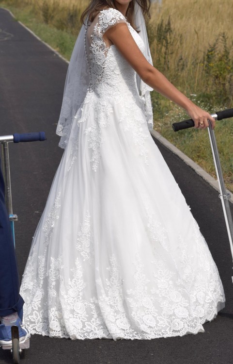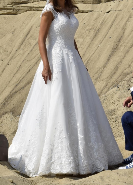 Suknia jednoczęściowa w kolorze: biel-śmietanka, u góry bogato zrobiona koronką, siateczka na plecach w kolorze cielistym zapinana na guziczki. Dół sukni składa się z tiulu oraz pięknie zdobionego szlaku. Na wierzchu sukni naszyte delikatne koraliki. Suknia jest wygodna, pięknie układa się w tańcu. Stan sukni bardzo dobry.