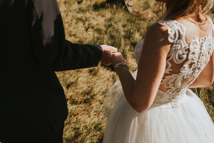 Suknia jest koloru śmietankowego. Plecy sukni oraz przód zdobione są gipiurą, na której naszyte są kamyczki oraz drobne perełki. Suknia zapinana jest na ozdobne guziczki.