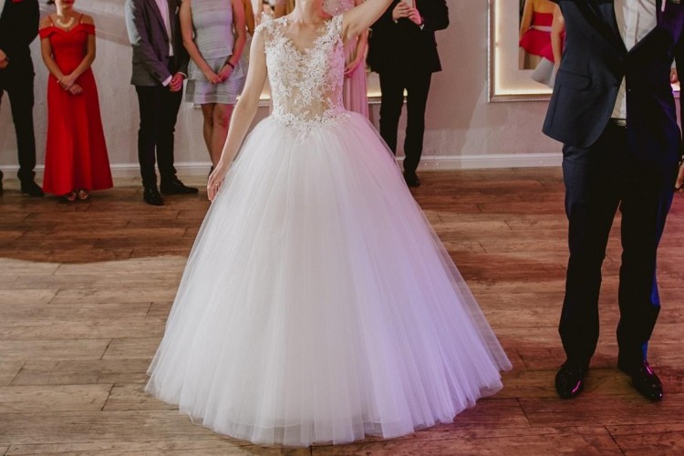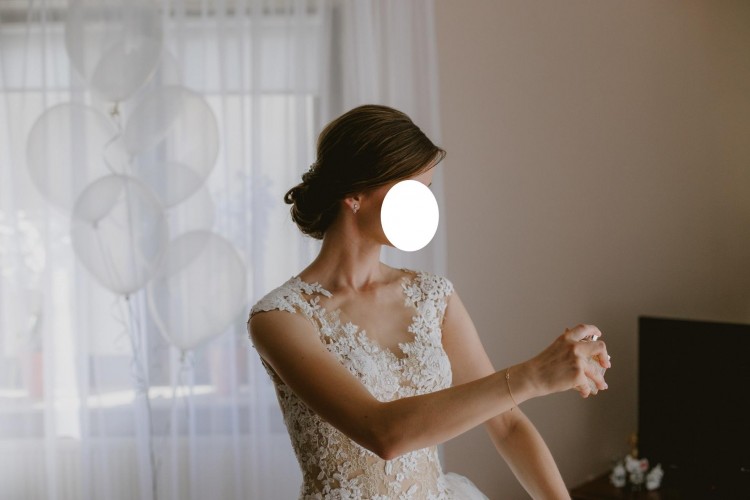 Suknie ślubne La Sposa słyną z wykonania z dużą troską o szczegóły z wyłącznie materiałów najwyższej jakości. Model Halar to wyrafinowana księżniczka prosto z hiszpańskich wybiegów o bogatym rozłożystym tiulowym dole z gorsetem lekko przedłużającym stan. Całość sukni dopełniają piękne zdobienia na transparentnej zabudowie gorsetu. Suknia ślubna Halar sprawia wrażenia wyjątkowo lekkiej i romantycznej. Na moje życzenie tren sukni został obcięty.