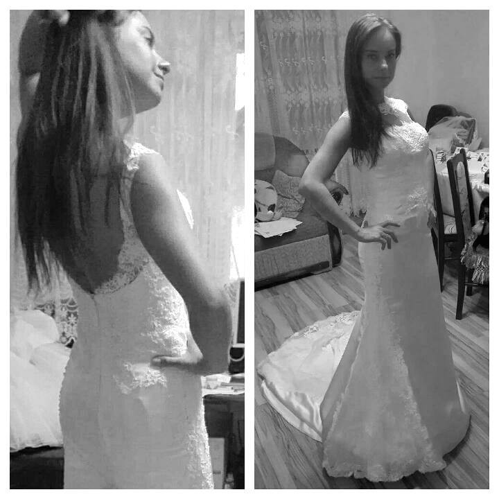 Sukni została przerobiona dla niskiej, szczupłej osoby. Została zmniejszona do rozmiaru 34, dla wzrostu 159 cm z 9 cm obcasem, suknia jest dopasowana od gorsetu do bioder, ud :)