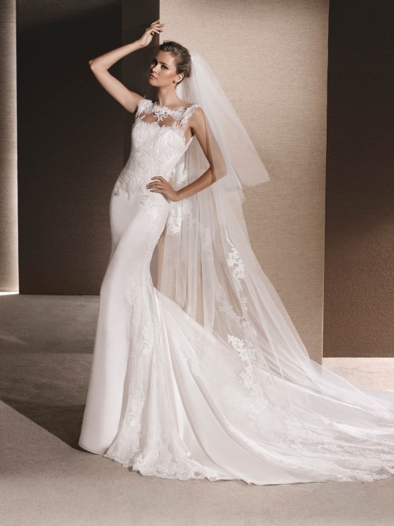 Jest to suknia wykonana z wysokiej jakości satyny o fasonie syrenki podkreślającym kobiece kształty. Została ona ozdobiona aplikacjami z koronki oraz gipiury z efektem 3D.