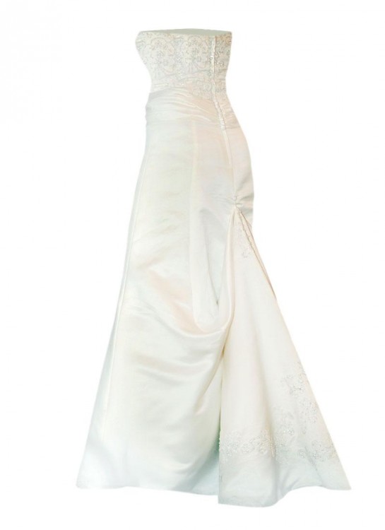 Suknia jednoczęściowa w kolorze ecru, pięknie zdobiona na gorsecie oraz fragmentarycznie na dole. Talia podkreślona atłasową szarfą, z tyłu podpinany tren. Suknia w stanie bardzo dobrym, po czyszczeniu, bez widocznych śladów użytkowania. Rozmiar 38/40.