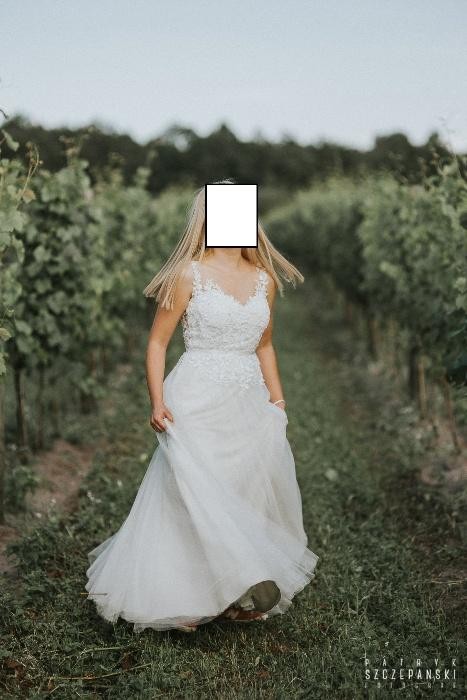 Sprzedam suknię ślubną kupioną w Salonie Celebrity z kolekcji Ladybird model 317083 (zdjęcia i opis dostępne również na stronie tego salonu). W komplecie halka z kołem oraz materiałowy pokrowiec. Wymiary: biust 87, talia 66, biodra 93, wzrost 164cm plus szpilki. Kolor Nude/Beige. Sukienka wyprana, stan idealny jedynie na samym dole na siatce z tiulu dwa rozcięcia na wys 4cm więc do skrócenia dla niższej osoby lub przeszycia.