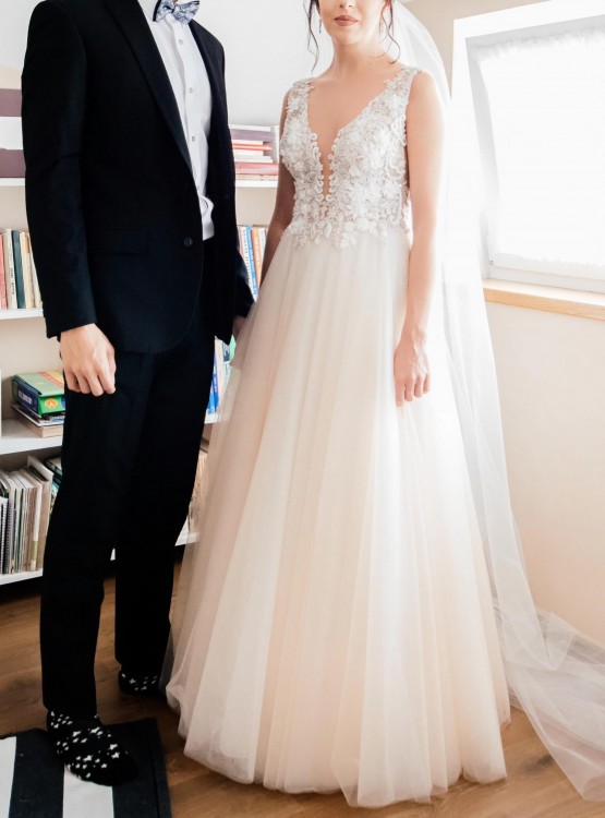 Pierwotnie suknia miała dość spory dekolt w kształcie litery V, który został minimalnie zabudowany na moje życzenie. Posiada ona przepiękne aplikacje.