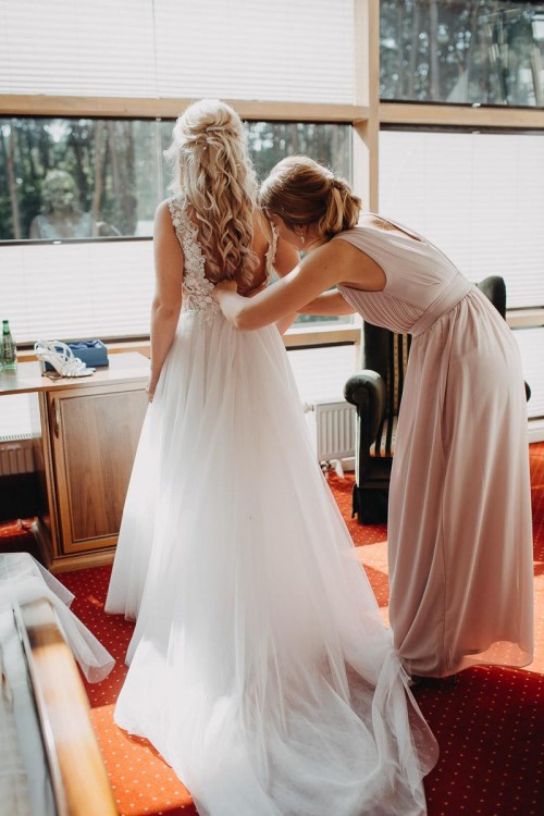 Dół składa się z kilku warstw tiulu, który pięknie się układa. Na samym spodzie jest muślin. Suknia ma tren, który można podpiąć.