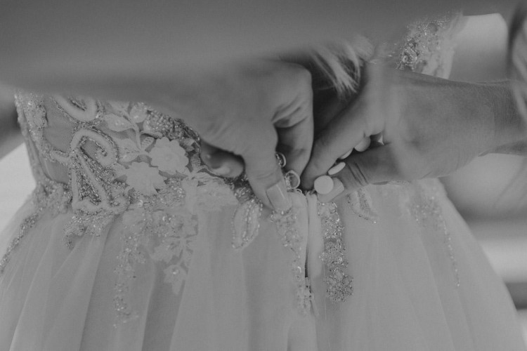 Góra sukni bogato zdobiona: kwiatki 3D, koraliki, perełki. Tył sukni na moje życzenie wycięty. Całość jest skomponowana w tak wyważony sposób, że suknia jest wytworna, a zarazem delikatna. Ma prawdziwą klasę.