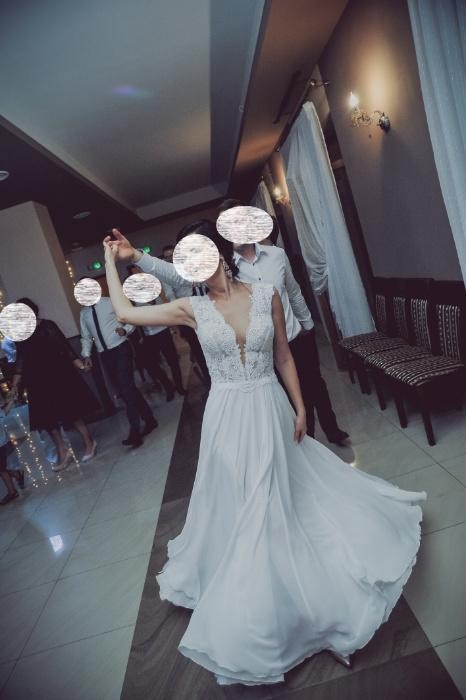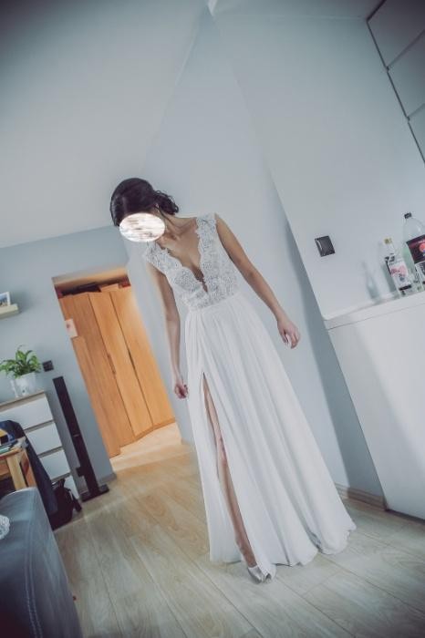 Suknia jest używana - założona dwukrotnie, w dniu ślubu oraz do sesji plenerowej.