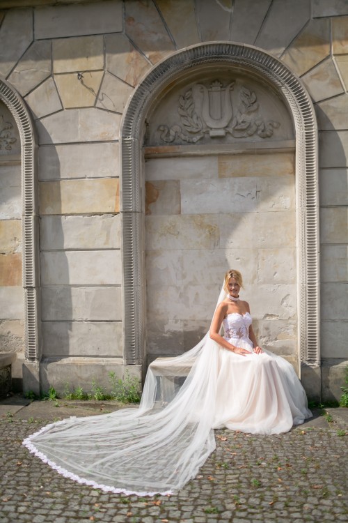 Gora suknii jest koloru białego, wykonana z przepięknej koronki,sznurowana i zasuwana na suwak (niewidoczny). Natomiast dół sukni z tiulu w kolorze pudrowego rozu.